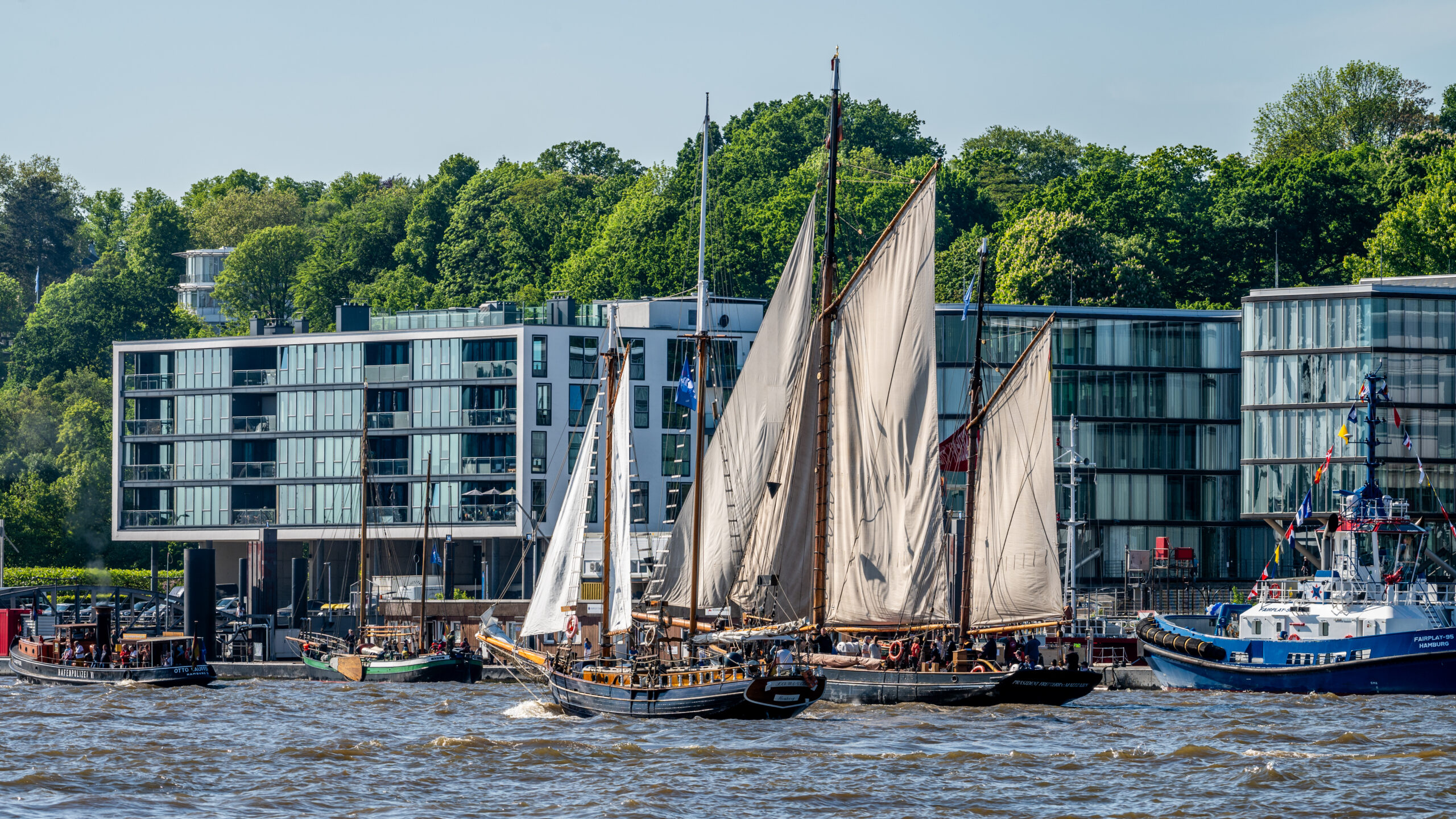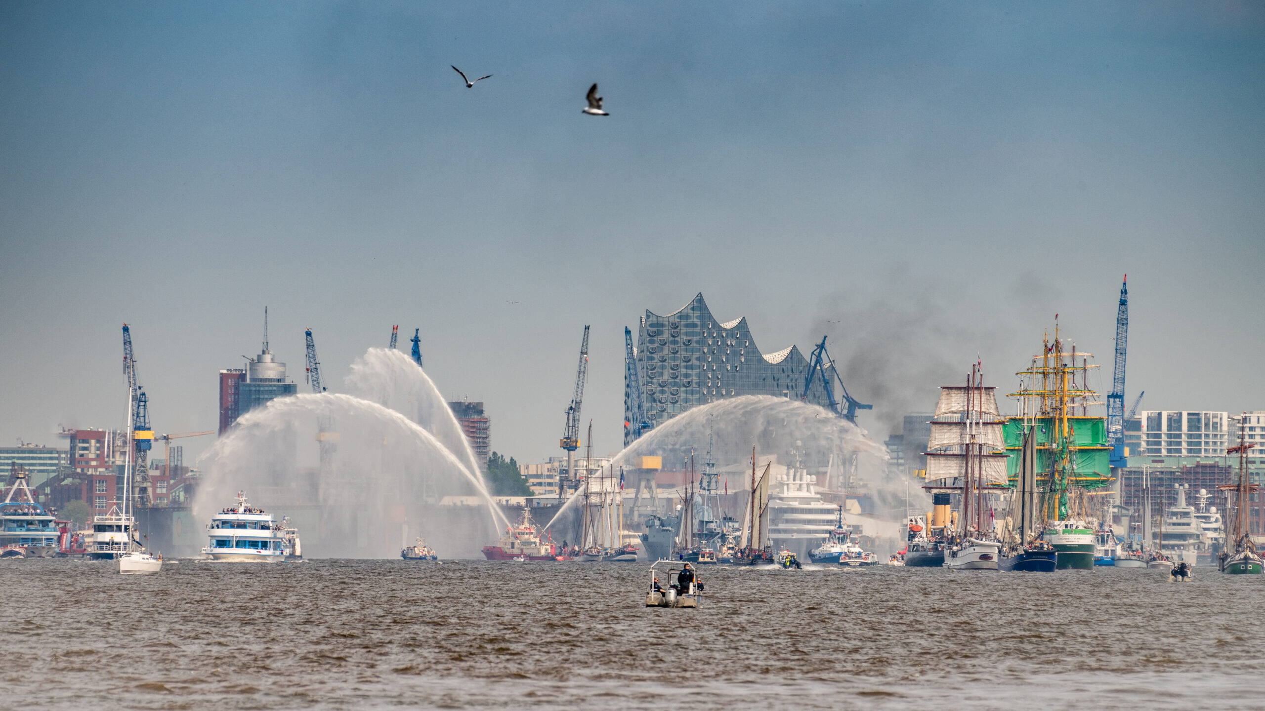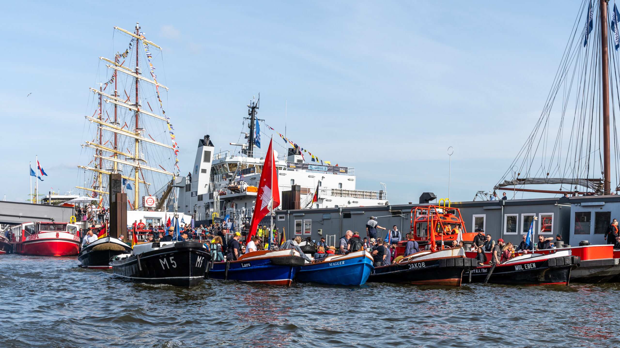 An den Paraden nahmen viele Schiffe teil. Bei der Einlaufparade durften wir im ersten Block gleich hinter der Cap San Diego mitfahren. Bei der Traditionsparade in der Mitte und bei der Auslaufparade am Ende. Macht aber nix, denn das BESTE kommt zum Schluß! 😉