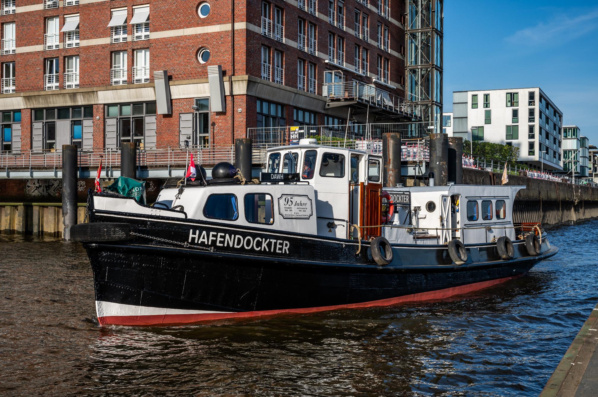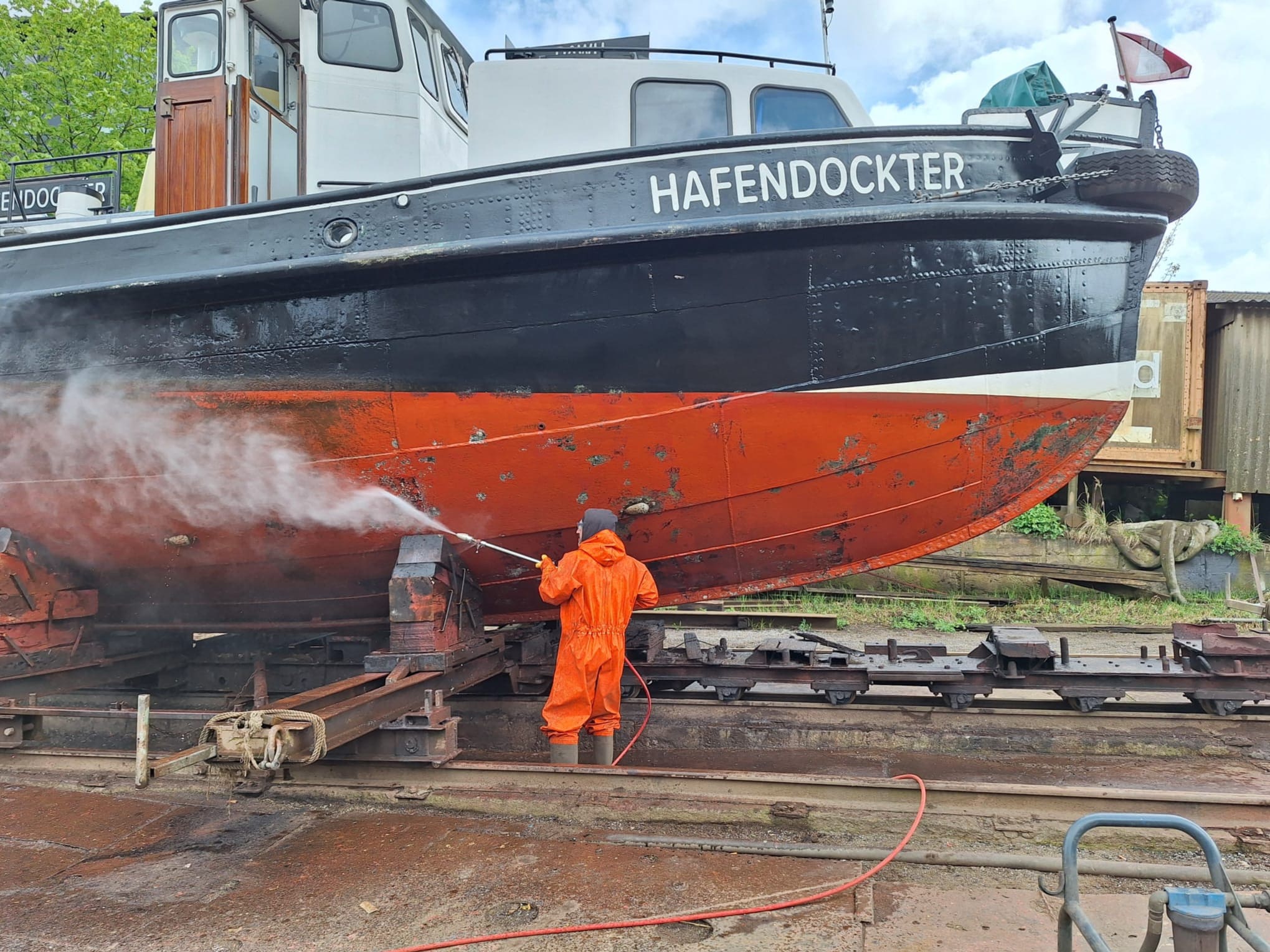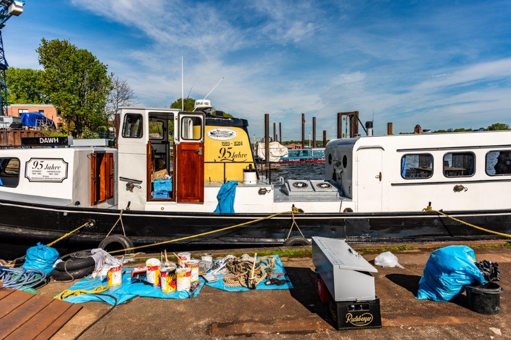 Fast pünktlich wurde der HAFENDOCKTER aus dem Wasser geslippt. Seine Crew stand mit Schleifmaschinen, Farbe und Pinseln bereit. Es wurde ordentlich ein Schlag reingehauen. Nun glänzt er wieder! Pünktlich zum Hafengeburtstag….